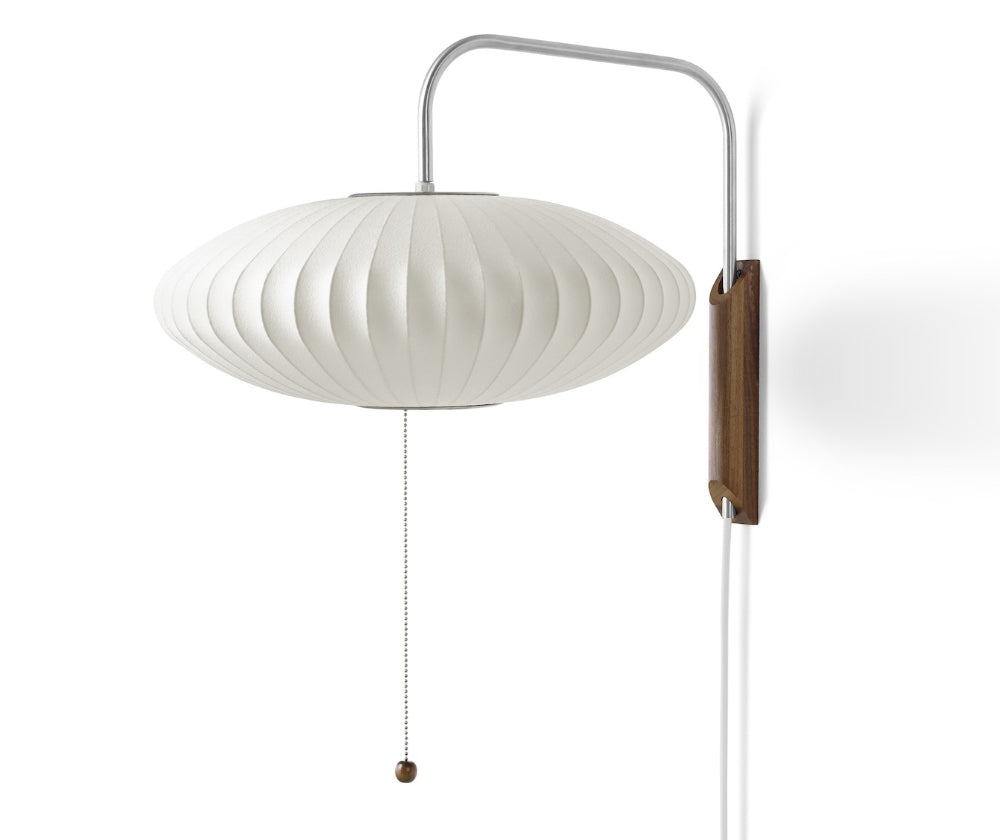 L’applique Nelson Saucer Wall est construite avec un support mural en noyer massif de 2 pouces d’épaisseur et un bras en acier qui s’étend sur environ 14 pouces. Le bras a une charnière pivotante et un fil d’alimentation réglable de 12 pieds, avec un contrepoids qui permet des ajustements en hauteur. Cette conception permet d’ajuster l’applique de gauche à droite et de haut en bas sans avoir à changer sa position sur le mur. Cet élégant luminaire illumine chaleureusement l’espace qui l’entoure.