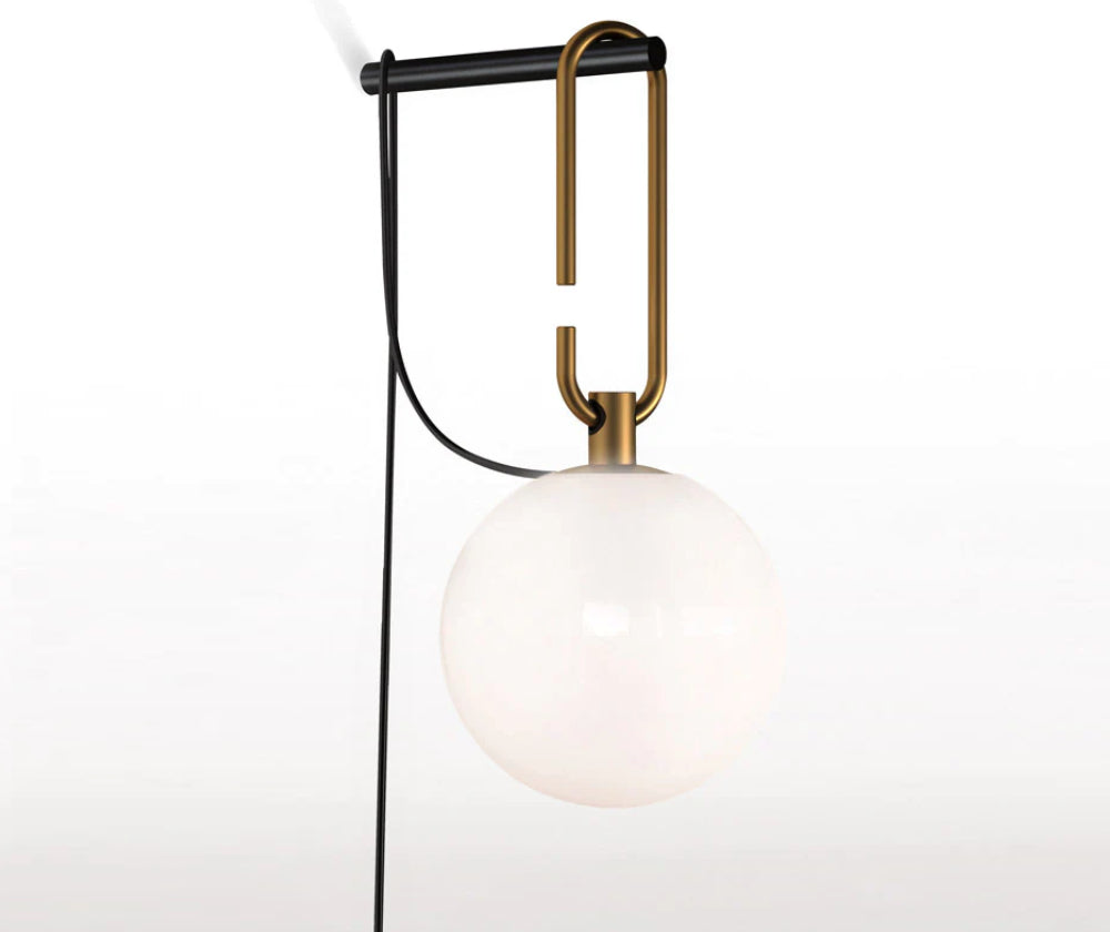 Une murale légère et raffinée qui se compose d’une élégante structure horizontale en métal noir sur laquelle est accroché un diffuseur en verre soufflé blanc. Cette sphère lumineuse est suspendue à l’aide d’un crochet en laiton brossé. Le diffuseur sphérique coulisse le long de la structure, offrant plusieurs types de configurations possibles.