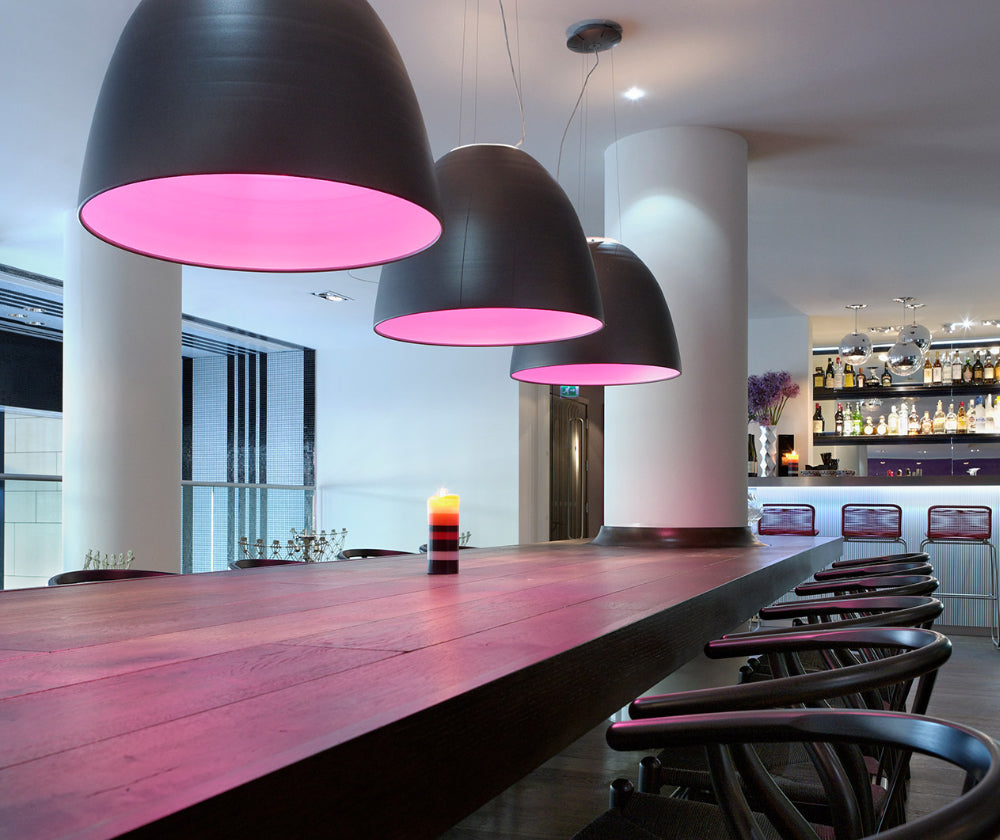 Nur, une collection au design classique et minimaliste qui réussit à métamorphoser la lumière. Le corps moulé en aluminium, le diffuseur inférieur en polycarbonate, le capuchon supérieur et le verre transparent rendent cette lampe suspendue spectaculaire, dans tous ses formats, couleurs et finis, mat ou brillant. Nur projette une lumière indirecte accompagnée d’un effet subtil de «halo» au plafond. Les lignes essentielles et géométriquement calibrées d'une parabole parfaite dissimulent un cœur optique qui contrôle parfaitement l'émission, sans heurter la vision directe. Il assure un éclairage d'ambiance général grâce également à l'émission indirecte.