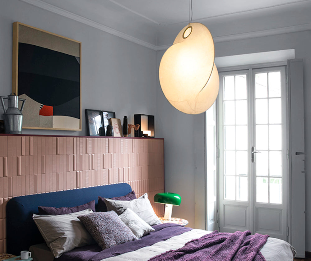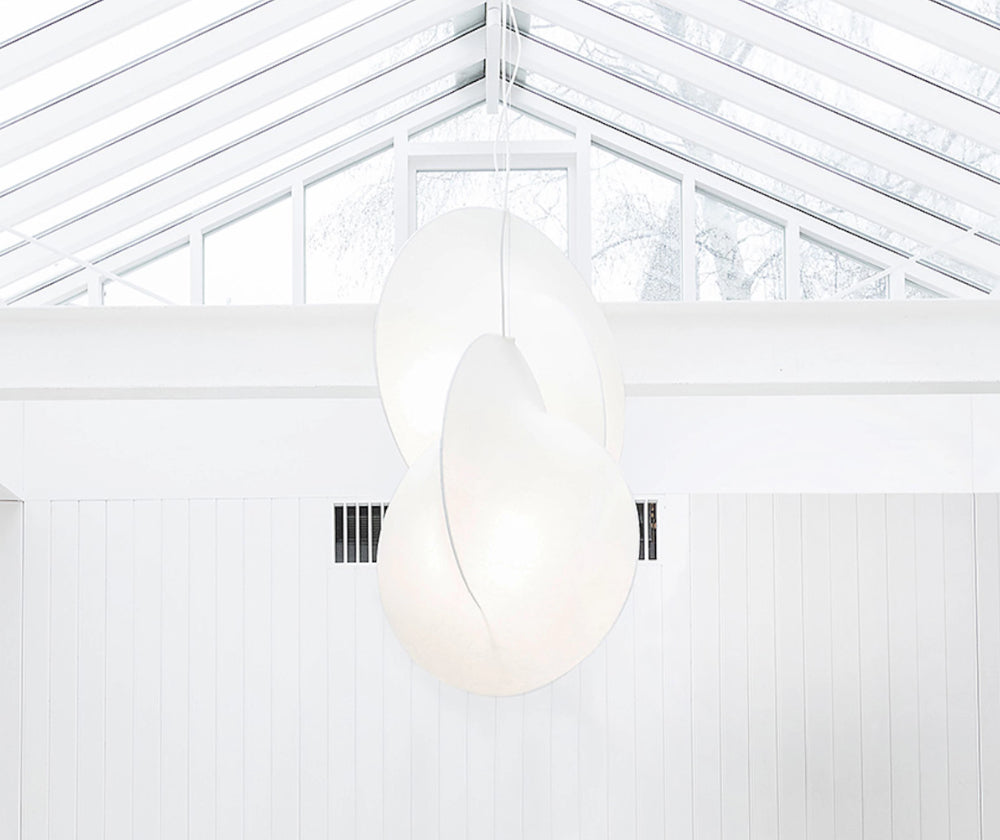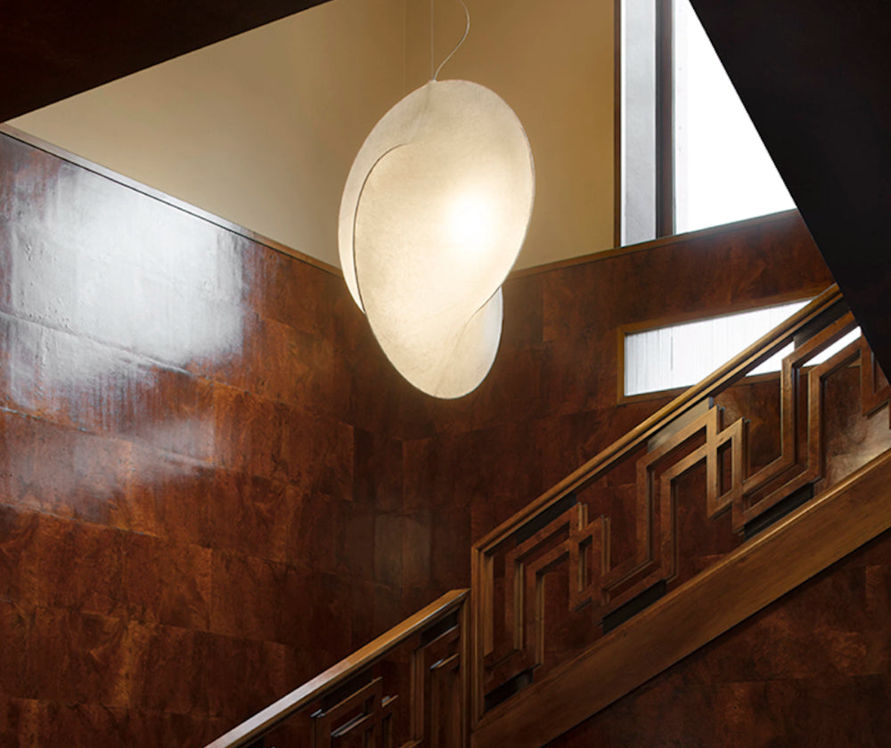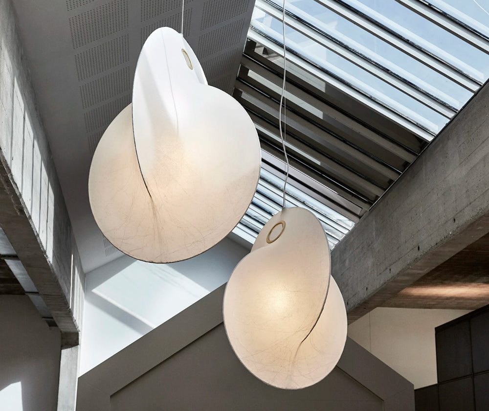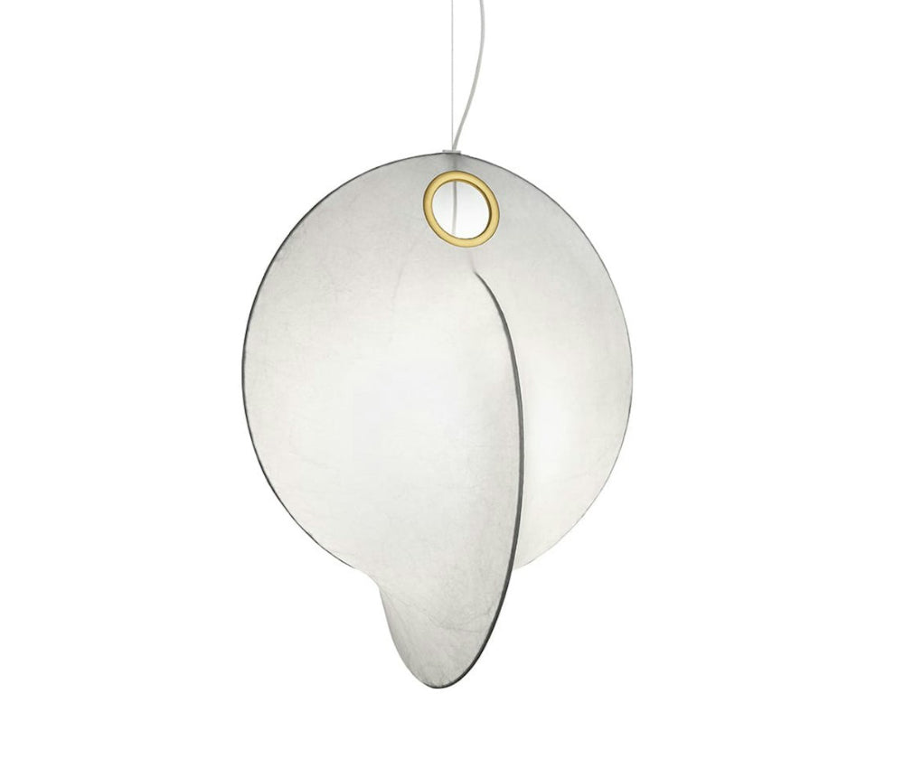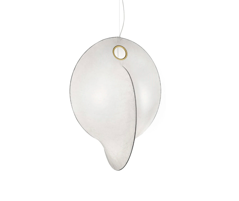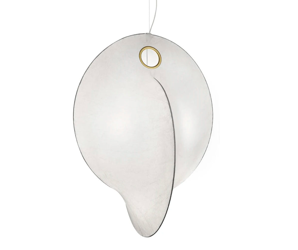 Ce luminaire en forme de cocon offre une sensation totalement reposante pour le regard avec sa lumière diffuse composée d'une structure interne en acier laqué blanc. Le diffuseur en résine cocon est appliqué par pulvérisation sur la structure, avec une protection transparente obtenue par pulvérisation en fin d'usinage. L'anneau du diffuseur est en acier poli, finition « galvanique » dorée.
