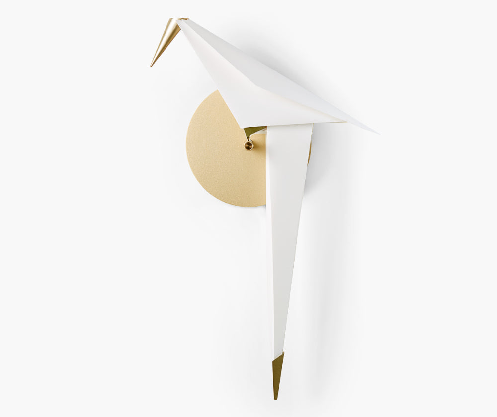 Fabriqué en papier synthétique plié et en laiton, Perch Light en version murale évoque un sentiment de liberté. Laissez l'oiseau gracieux se balancer et rayonner... Celui-ci est libre de se balancer lorsqu'il est doucement touché en le mettant en mouvement d'un léger toucher de la main.