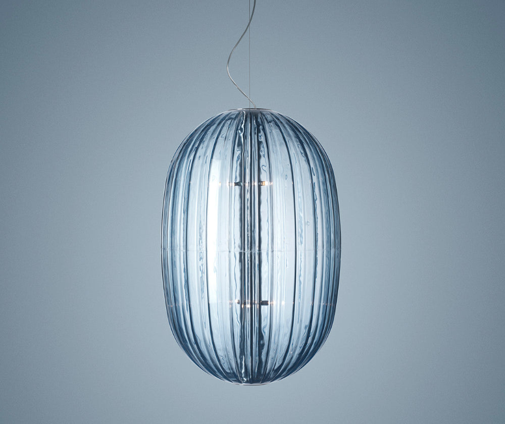 Plass Media ressemble à une perle de verre de Murano frappée par les rayons du soleil, mais ici la lumière vient de l’intérieur, plutôt que de l’extérieur, réfléchie par les incisions à la surface. Une suspension à la surface singulière, volontairement « imparfaite » qui vibre avec la lumière de l'intérieur.
