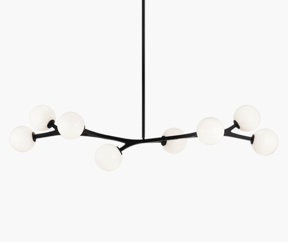 Une série d'inspiration milieu du siècle, composée d'éléments en forme de branches ornés de verre opale. Le modèle Rami, élégant et gracieux, apportera une touche de raffinement à n'importe quelle pièce. Les tiges de la structure sont soit de couleur laiton vieilli ou noir, assorties aux huit globes de verre opalescent. Le style est tout à fait versatile et ajoutera de l'élégance à vos intérieurs.
