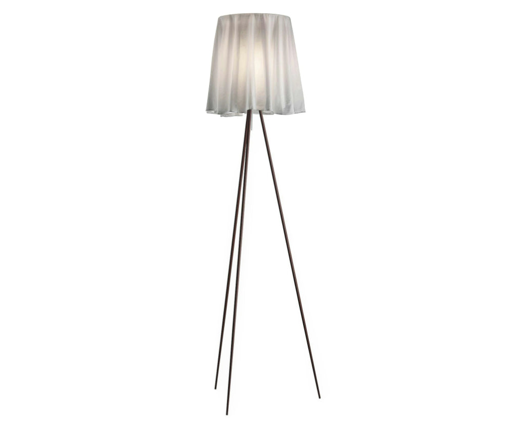 Un luminaire classique, du célèbre Philippe Starck, conçu en 1994. L'éclairage diffus, grâce à l'abat-jour en tissu, lui donne un aspect très chaleureux. Le piétement en forme de trépied de couleur anthracite est très délicat. Dans le haut du luminaire, une petite tige sert de variateur d'intensité lumineuse au toucher.