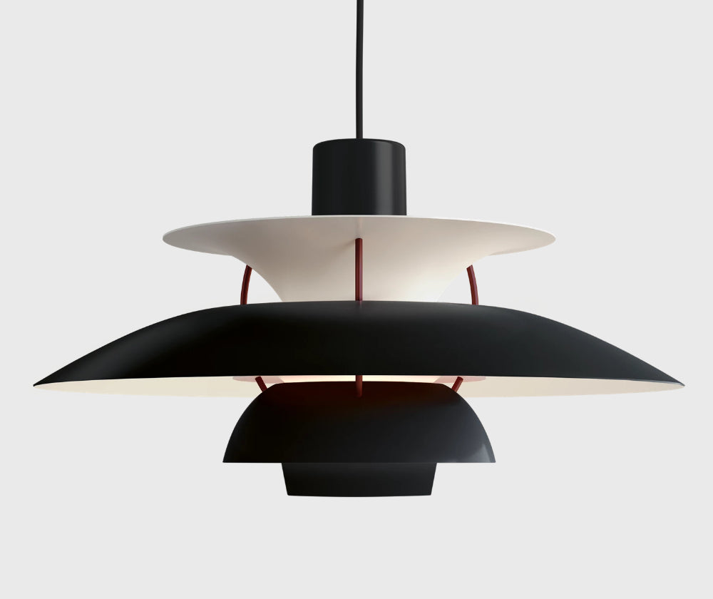 L'édition limitée PH 5 Black revisite ce modèle iconique, avec une nouvelle finition monochrome mate. Elle est ornée de montants bordeaux et d'un anneau anti-éblouissement rose pâle monochrome. Cette combinaison de couleurs est proposée pour la première fois. Son design repose sur le principe d'un système à trois abat-jour réfléchissants, qui dirige la majeure partie de la lumière vers le bas. Le luminaire émet une lumière à la fois vers le bas et latéralement. Pour améliorer les caractéristiques de reproduction des couleurs de la source lumineuse, de petites nuances rouges et bleues ont été insérées pour compléter et atténuer la couleur pour l'œil. L'élégante PH 5 est un élément moderne et saisissant à ajouter à n'importe quel espace. Disponible pour une durée limitée !