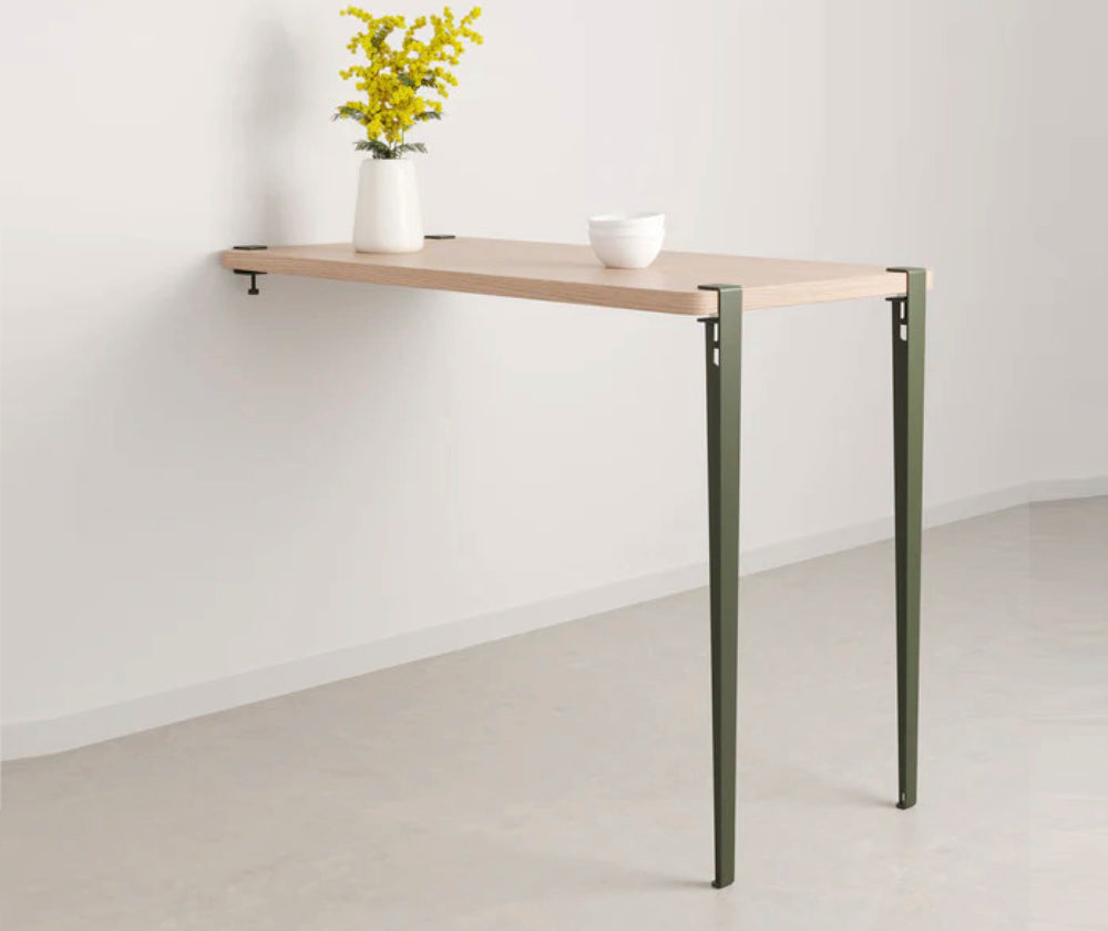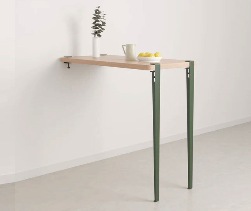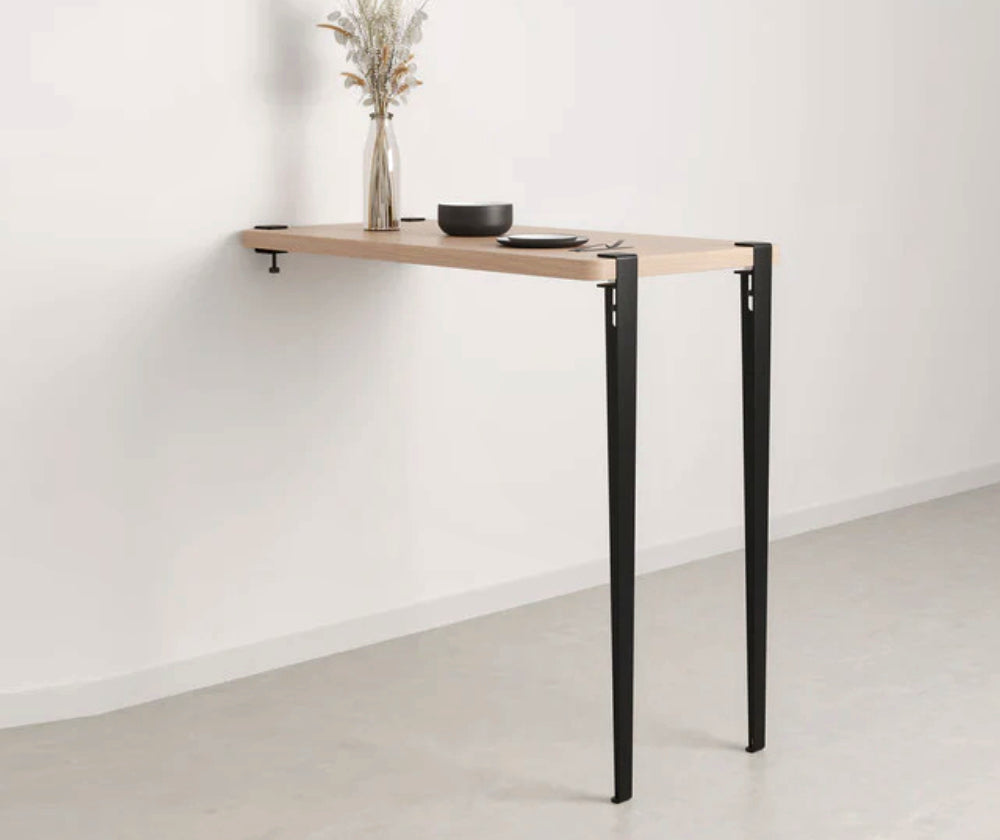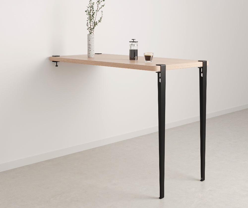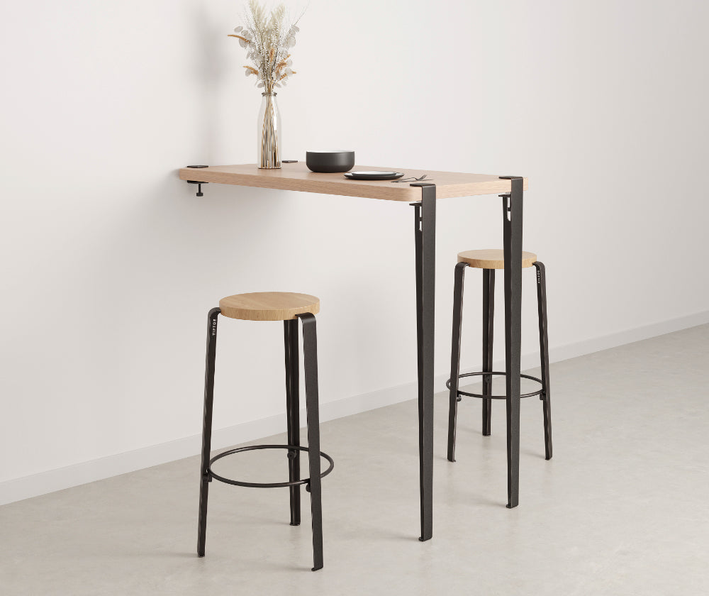 La table haute murale TIPTOE se compose d’un plateau en bois éco-certifié, de deux pieds en acier robustes de 110 cm de hauteur, et de deux accroches murales ingénieuses. Facile à installer, elle s’adapte à divers usages : plan de travail pratique, îlot central esthétique, table haute conviviale. Idéale pour optimiser les espaces, cette table apporte à la fois style et fonctionnalité à votre cuisine ou salle à manger.